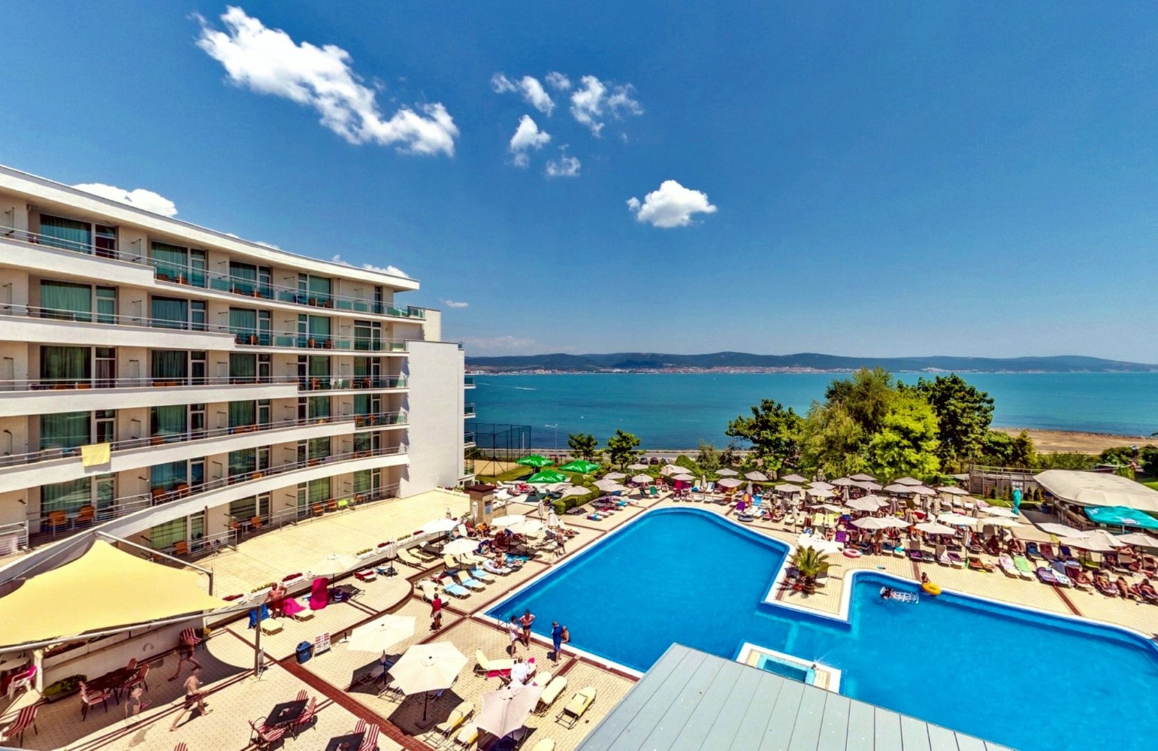 Само на няколко крачки от широките плажове на Слънчев Бряг. Приятна в разходка до древните забележителности на стария град. Бизнес посетителите и туристите ще приветстват впечатляващия списък от услуги, съоръжения и забавления които се предоставят в този високо класен хотел. Има удобства за инвалиди. Домашни любимци не се допускат. Гледката откъм морската част на хотела обхваща целия залив на Слънчев бряг, Свети Влас и Несебър.