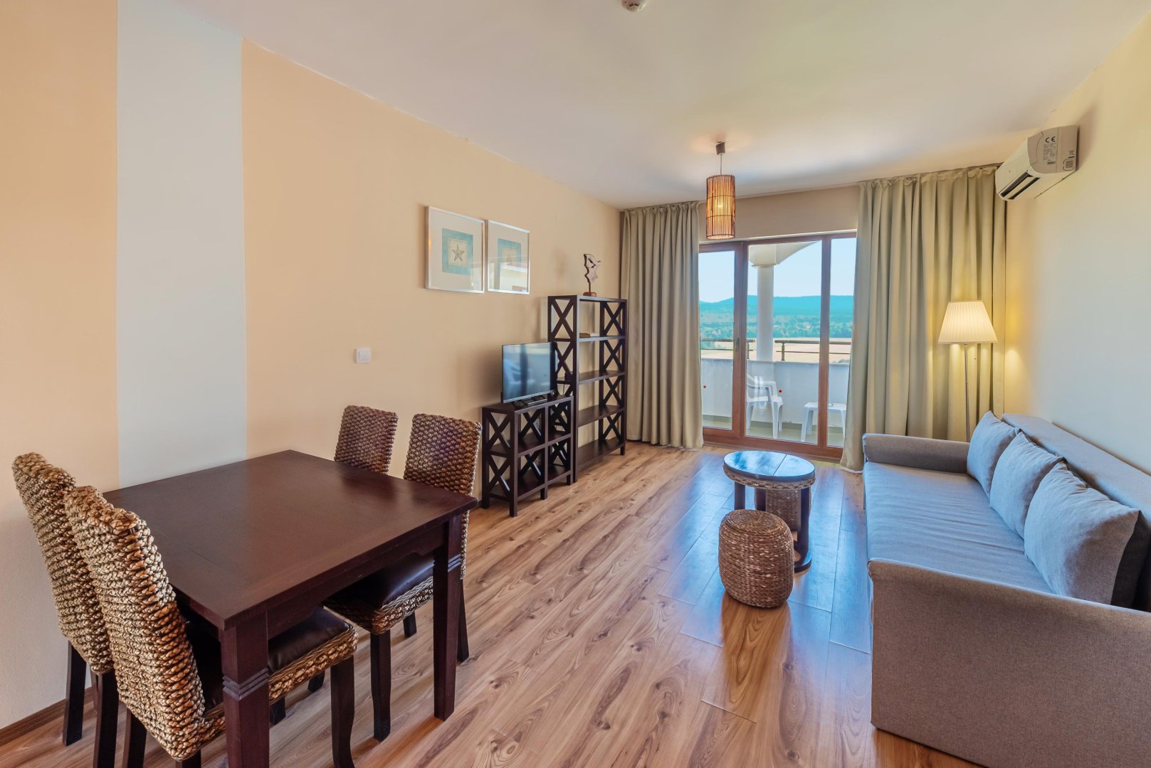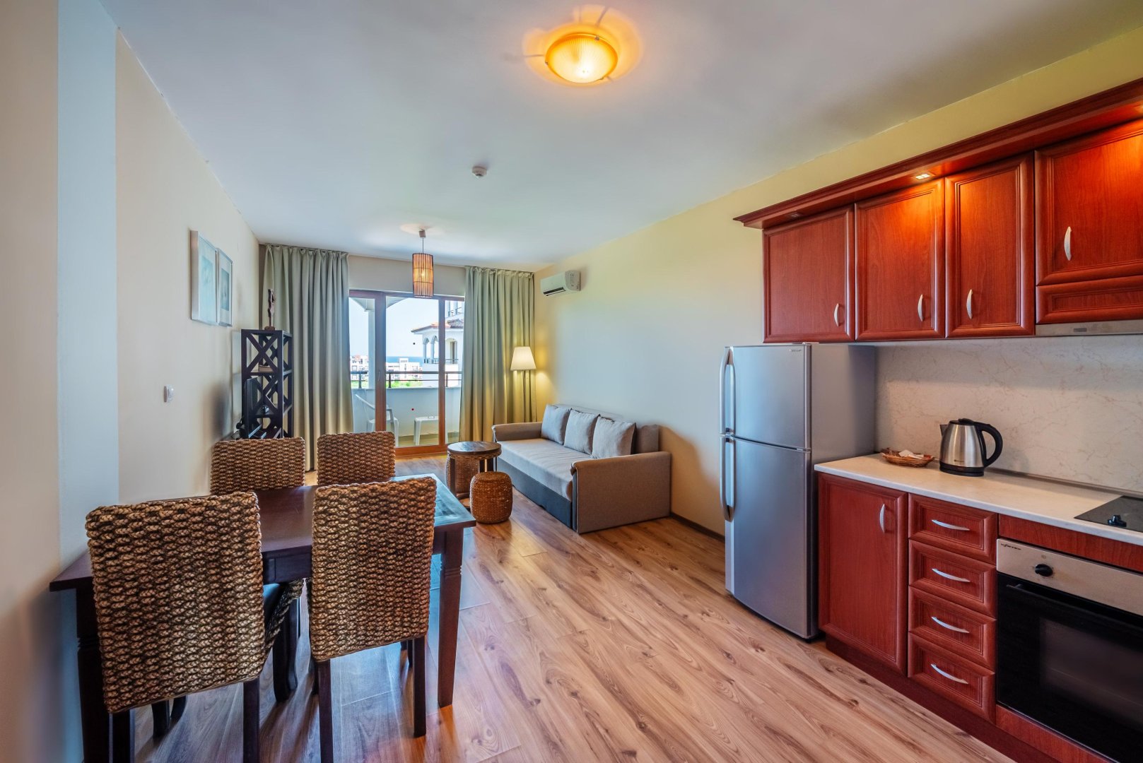 Апартаменти с една спалня (63 кв.м.) предлагат всички удобства и максимален комфорт за настаняване на семейства от 2-ма възрастни и 2 деца или 3-ма възрастни.
