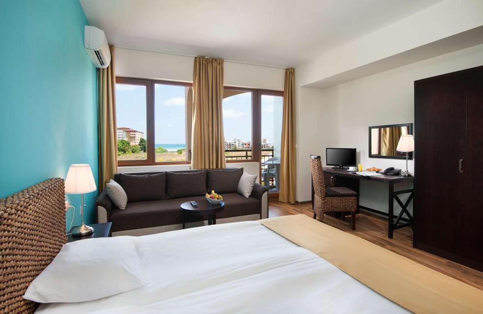 Стаите (28 кв.м.) в хотела разполагат с две единични легла, които могат да бъдат събрани като спалня, допълнително двойно легло или разтегателен диван подходящ за настаняване на 2 деца или един възрастен, баня с душ и WC, сешоар, климатик, сат. тв, LCD телевизор, телефон, мини хладилник,сейф, балкон или тераса.