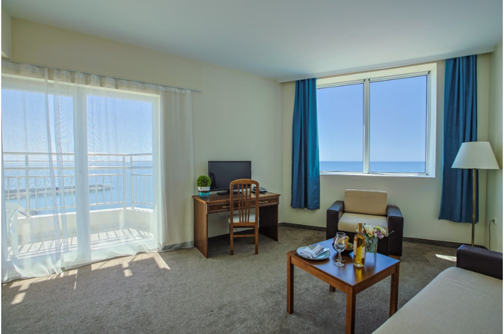 Апартамент с 1 спалня - Комфортно обзаведени като двойните стаи, но с допълнително всекидневно помещение, в което е възможно настаняване на разтегателен диван за трети и четвърти човек или за две деца. Всички апартаменти са с директен или страничен морски изглед, климатизирани, с директна телефонна връзка, сейф, минибар, сателитна телевизия, wifi, душ...