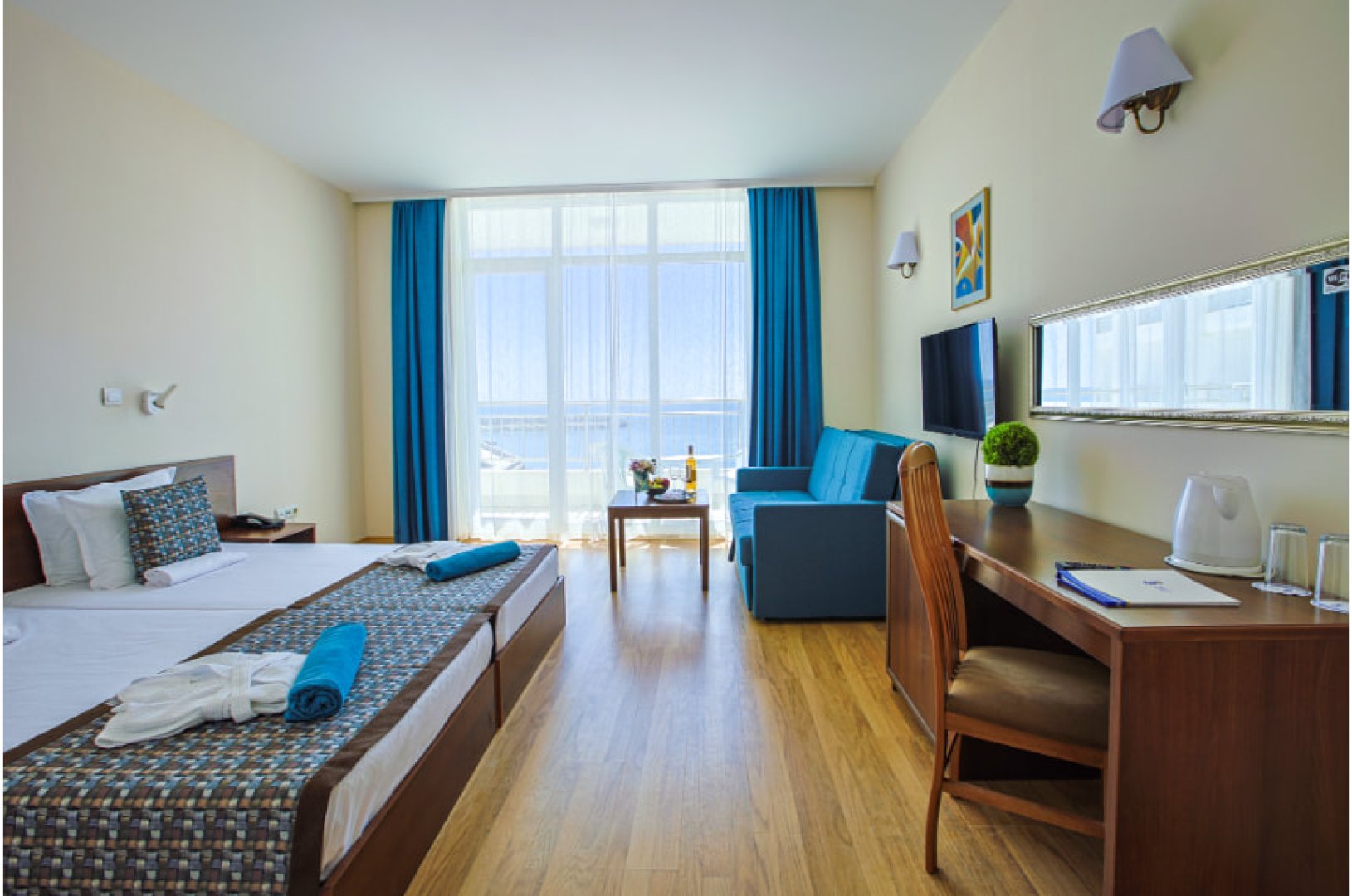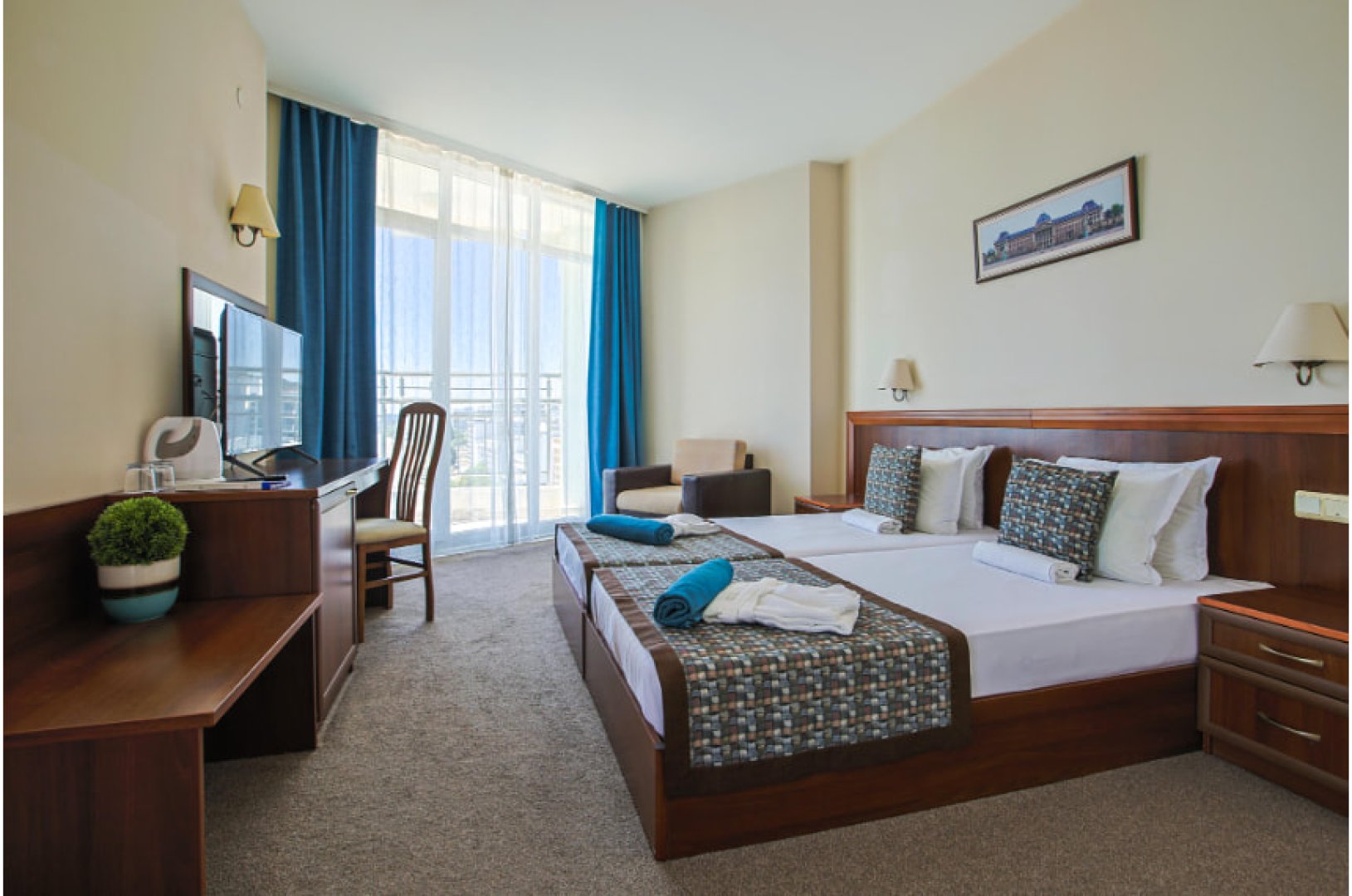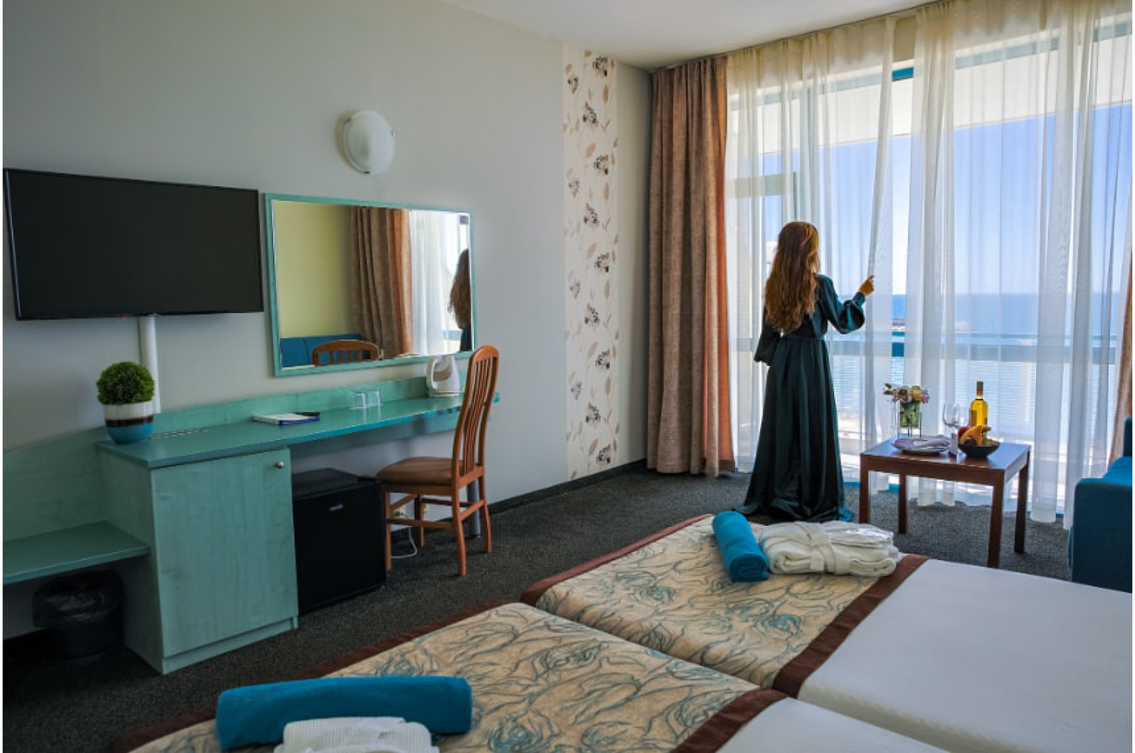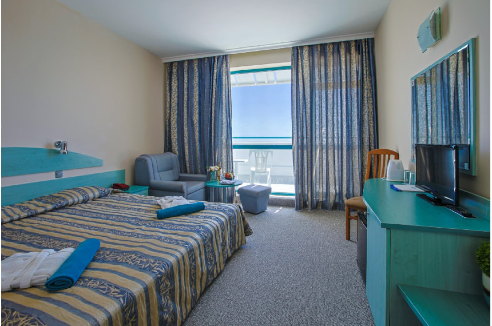 Двойна стая - комфортни и климатизирани стаи с директна телефонна връзка, сейф, минибар, сателитна телевизия, wifi, душ или вана, сешоар и балкон. Настилка в стаите: мокет, ламинат, гранитогрес. Има възможност за две отделни легла или събрани легла – при желание. Допълнителното легло е разтегателно. Стаите са с изглед парк или море. Бебешка кошара.