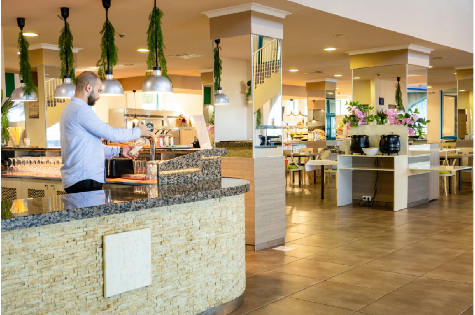 Берлин Голдън Бийч, Златни Пясъци предлага климатизиран модерно оборудван основен ресторант, преклагащ блок маса за закуска, обяд, междинни закуски и хране и вечеря от програмата All Inclusive