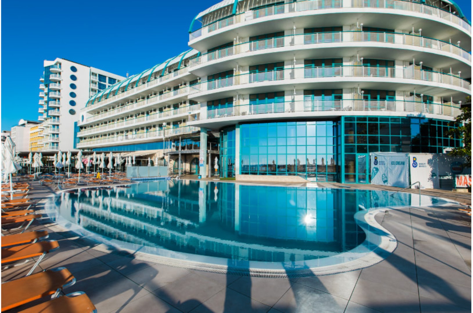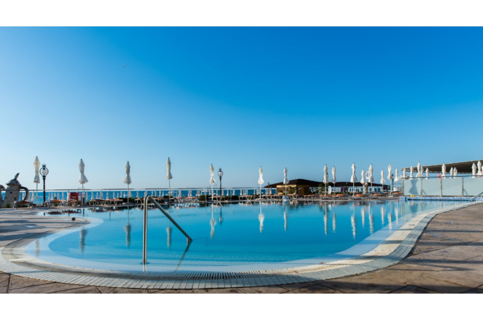 Безплатно ползване на външен басейн, чадър и шезлонг около басейна на хотела или на плажа (един чадър и два шезлонга на стая) при наличие на свободни места. Местата са ограничени.