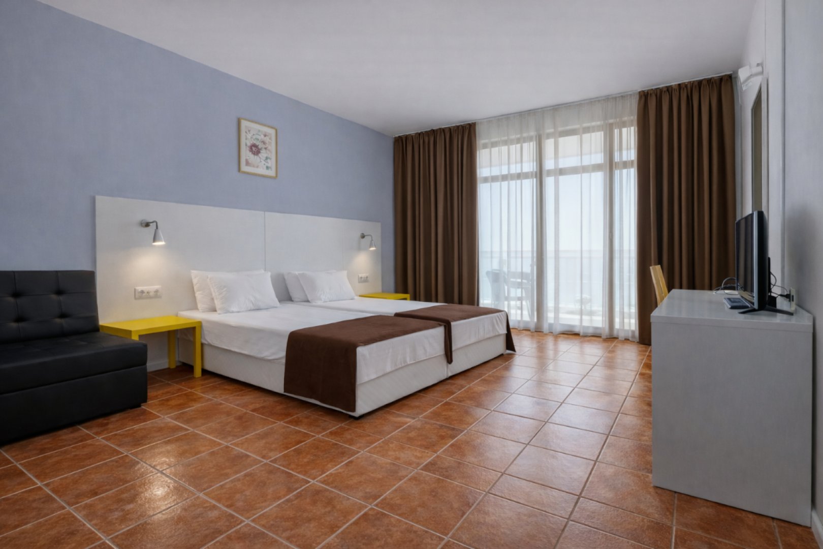 Двойна стая: 25-30 кв. м., разполага с двойнo легло или 2 единични легла и разтегаем диван.
