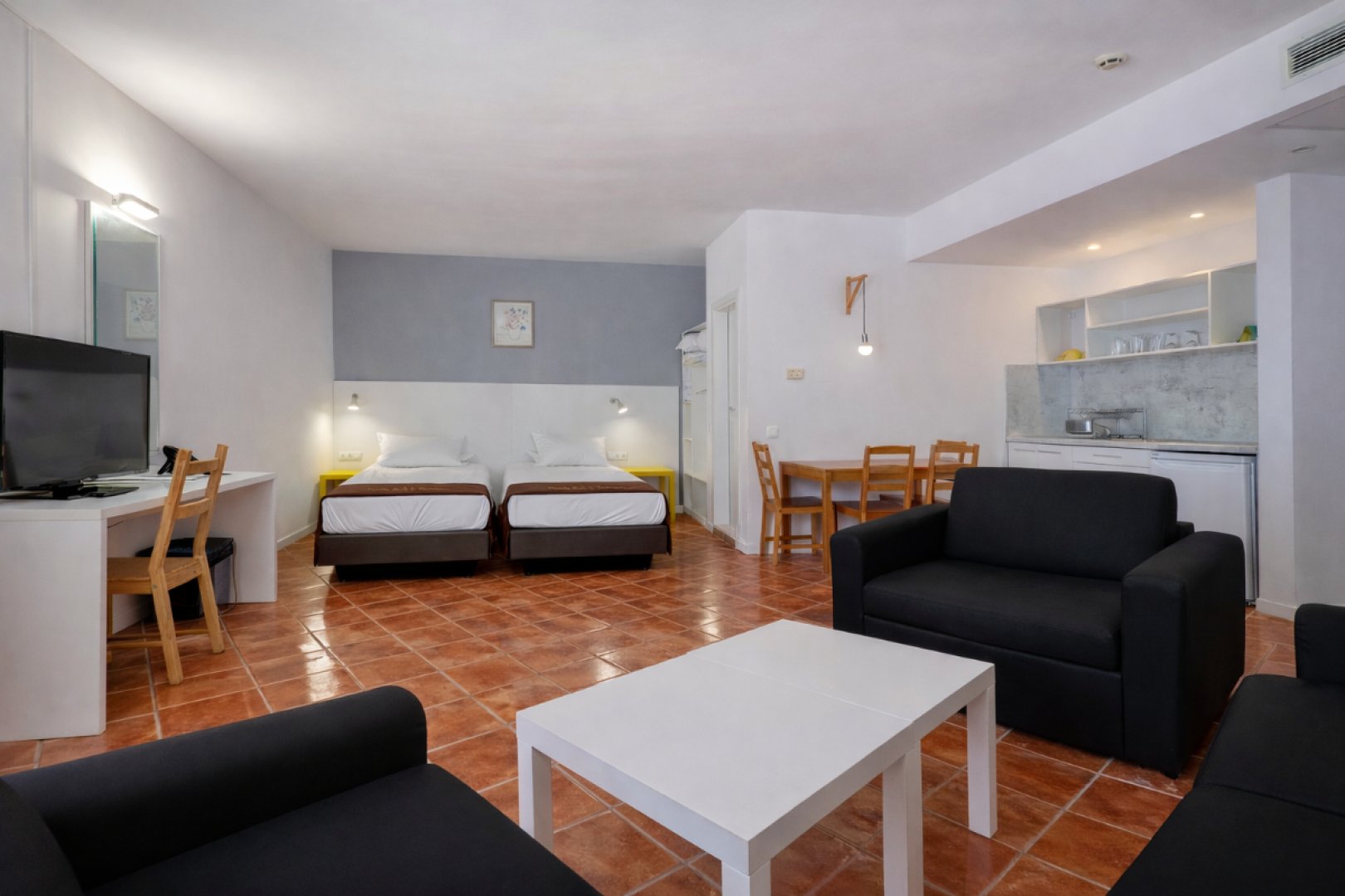 Фамилна стая: 32-38 кв. м., едно помещение, разполага с двойно легло или 2 единични легла и разтегаем диван, кухненски кът.